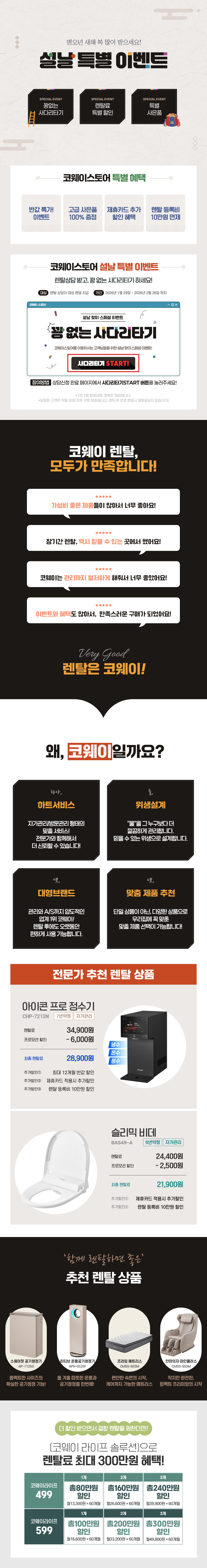 - 1. 2대 이상 구매 시 특약은 정수기, 비데, 청정기 등 회사가 정하는 모델을 대상으로 렌탈 또는 매매를 혼합하여 2대 이상 구성 시 적용됩니다.